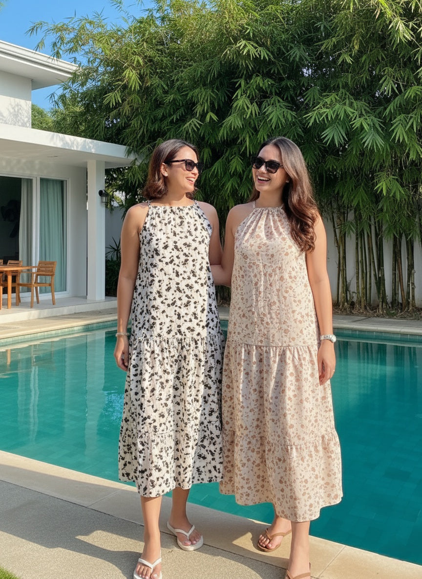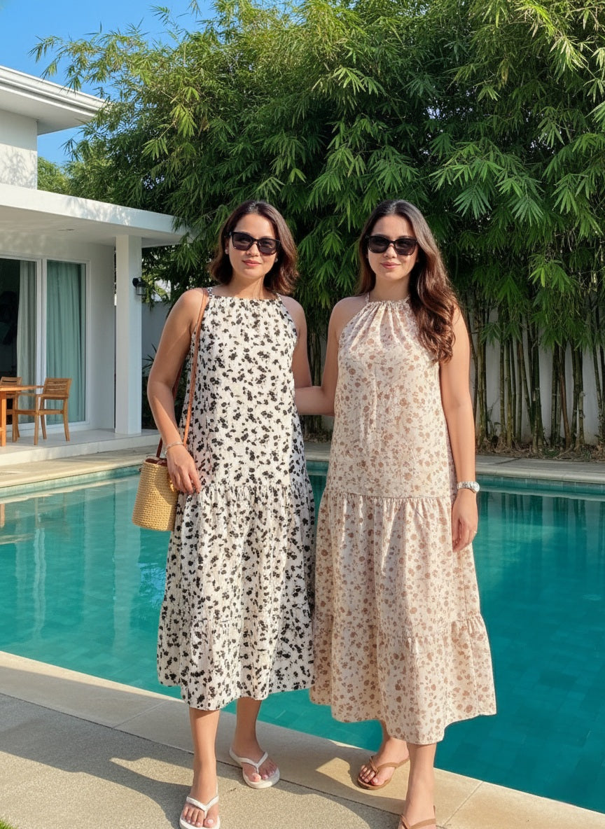 Bask in effortless elegance with our Isla Halter Midi Dress, featuring a soft cream base adorned with a delicate vintage-inspired rose print. Designed for sun-drenched days and breezy afternoons, this dress flatters with its halter neckline and relaxed, tiered silhouette that flows with every step.