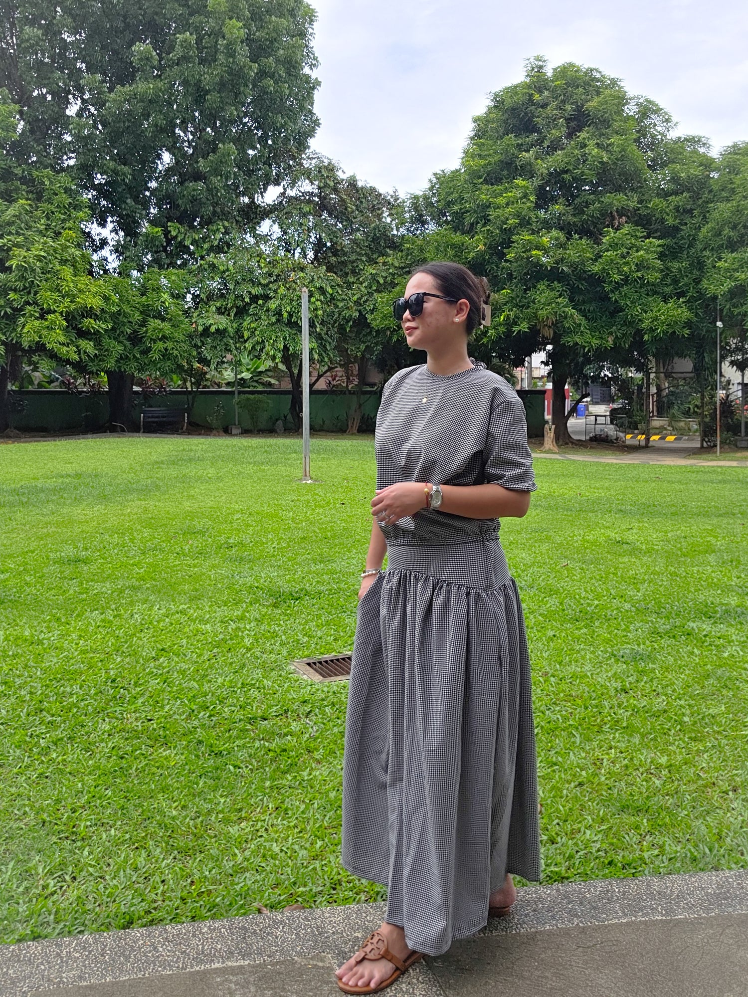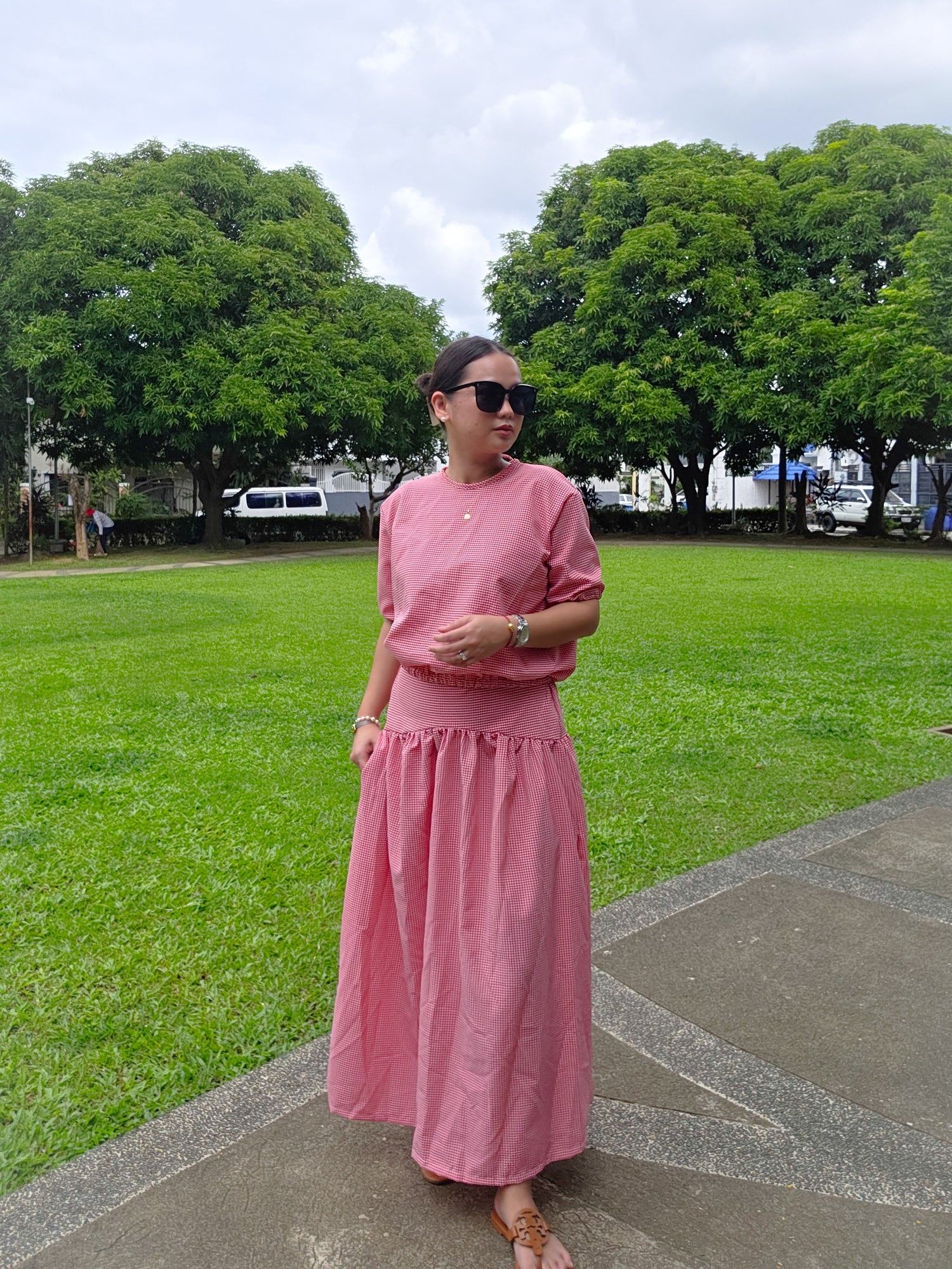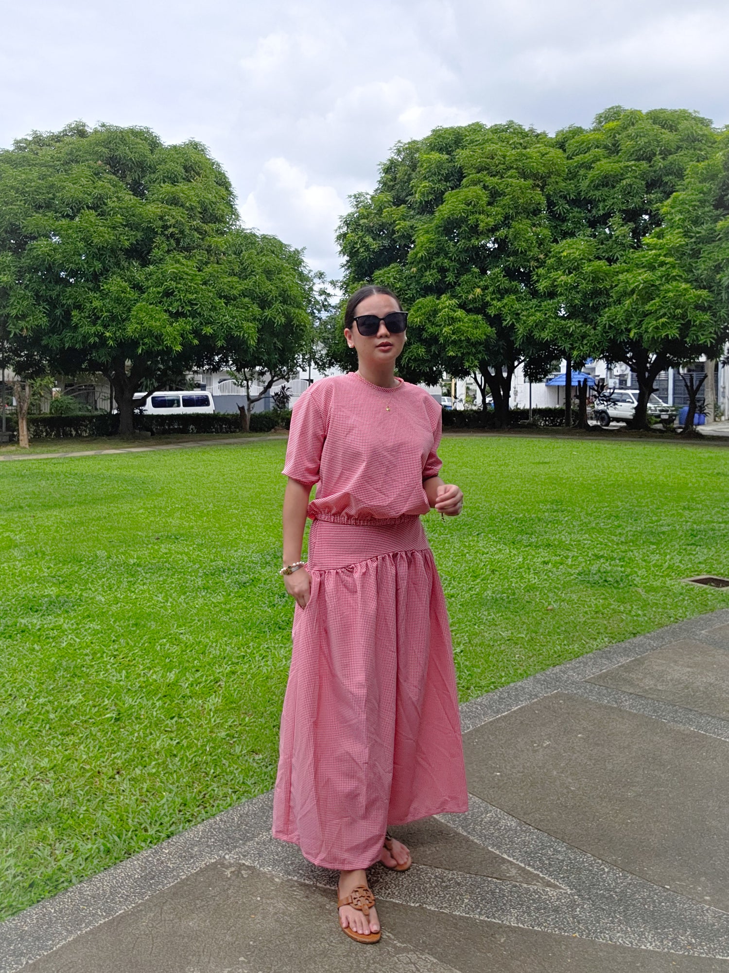 Step into timeless charm with this classic coordinates set, crafted from lightweight seersucker gingham fabric. The airy top features subtle puff sleeves and a relaxed fit that softly gathers at the waist, creating a flattering silhouette. Paired with a matching high-waisted skirt, this set brings effortless polish and comfort in one breezy ensemble.