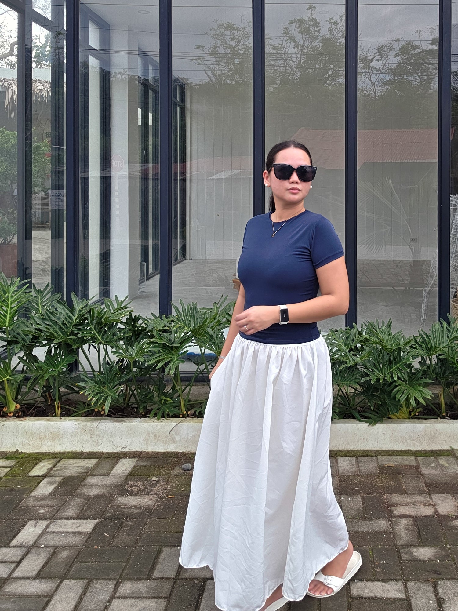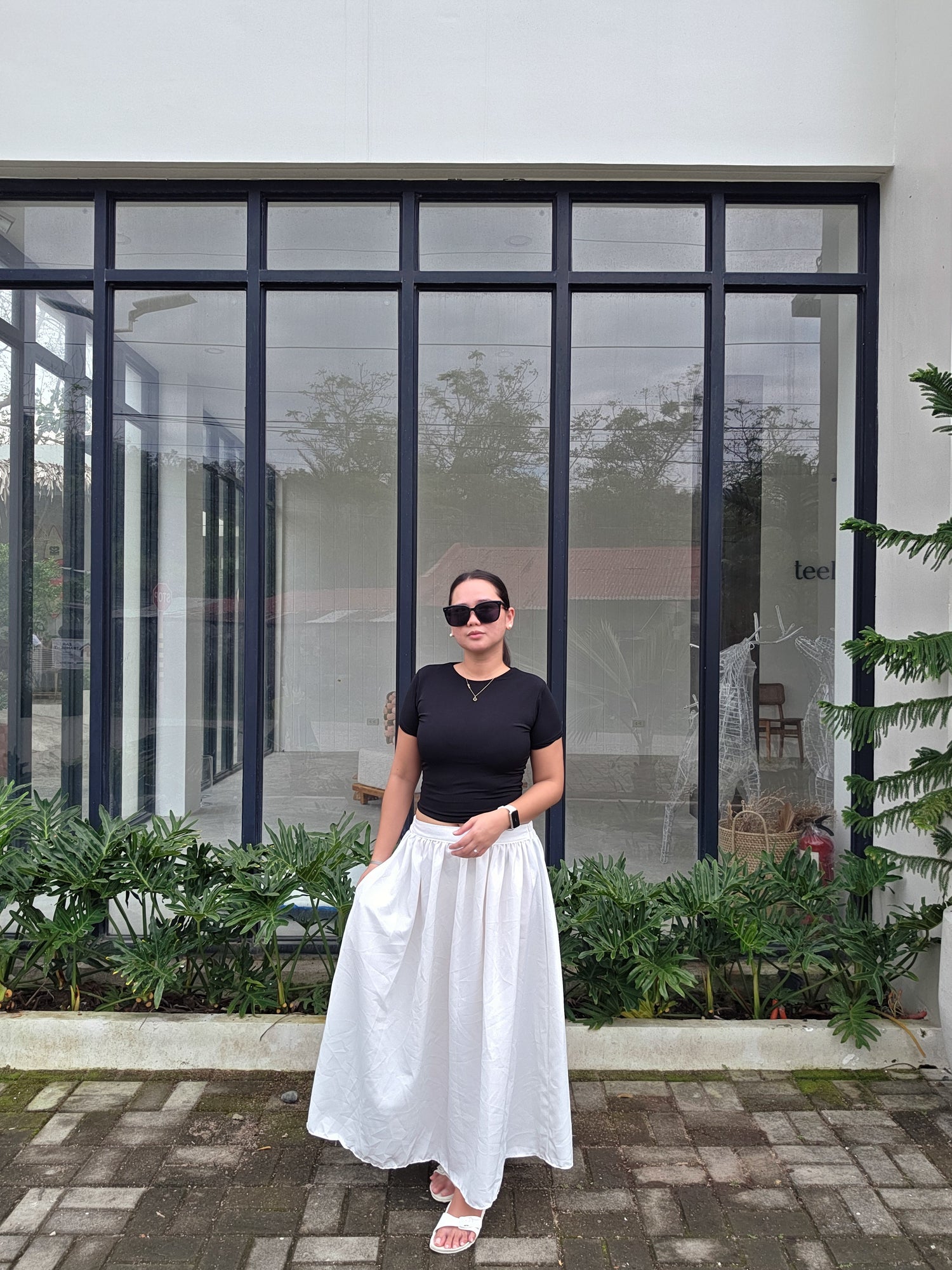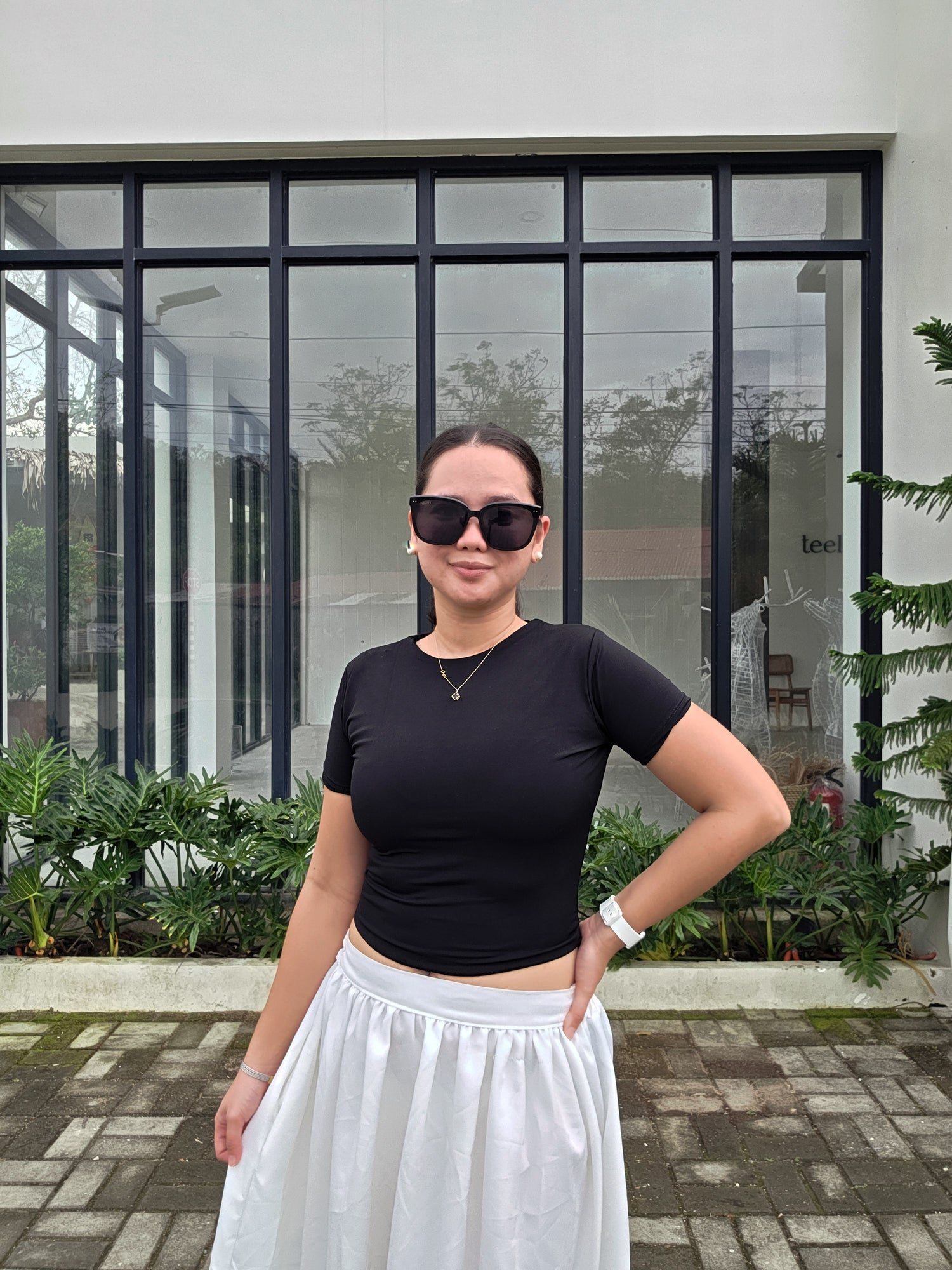 - Effortless Contrast: Pair with a flowy white midi skirt (as pictured) to balance the fitted silhouette. Add oversized sunnies for instant chic.